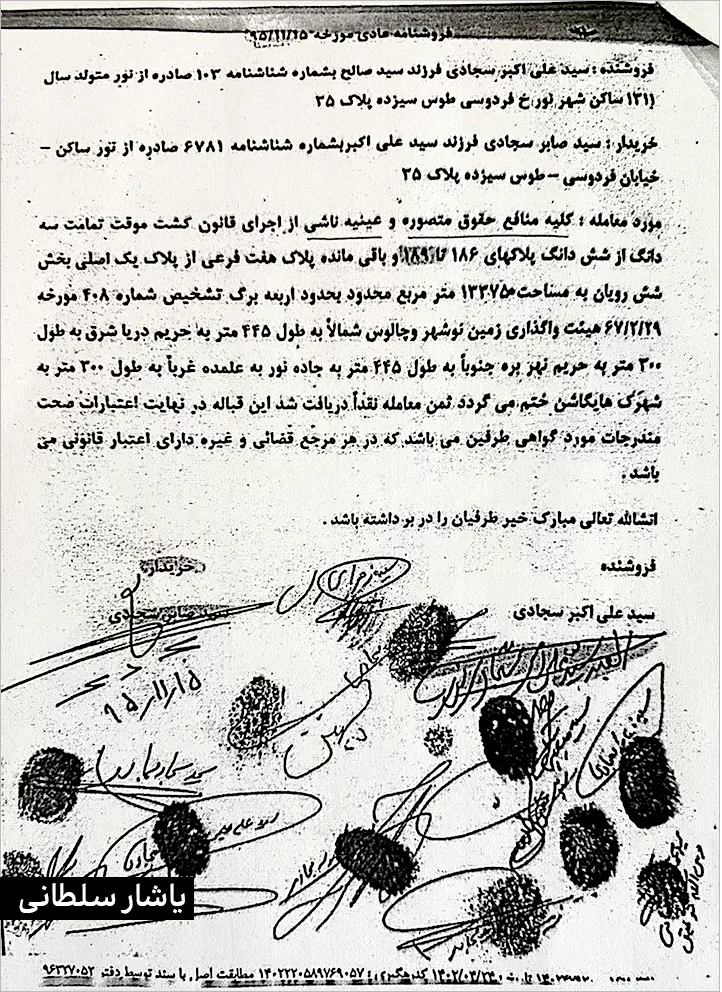 یاشار سلطانی: در این گزارش نگاهی داریم به ۱۳۳,۷۵۰ متر از زمین‌های مرغوب و ساحلی شهرستان نور که روزگاری سند آن به نام محمدرضا پهلوی خورده بود و زمانی دیگر در تصرف یک روحانی پرنفوذ و فرزندانش بود. پرونده مربوط می‌شود به خانواده آیت‌الله سید علی اکبر سجادی نوری!