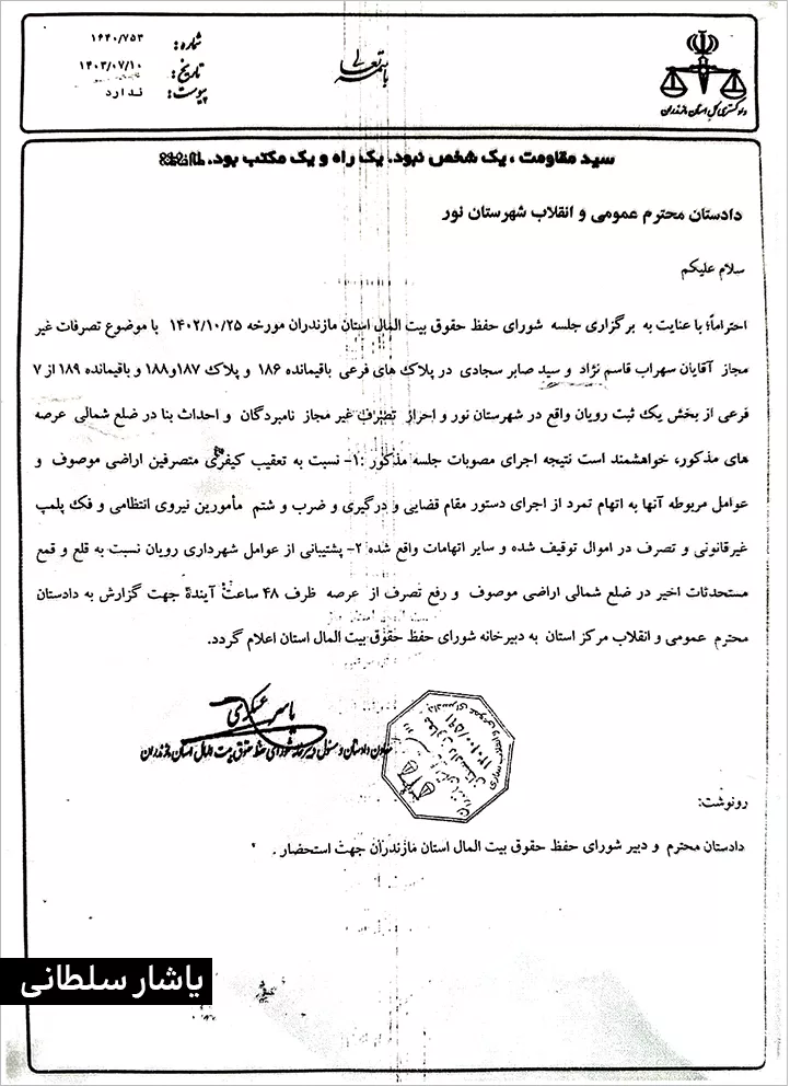 نامه شورای حقوق حفظ حقوق بیت المال به دادستان نور