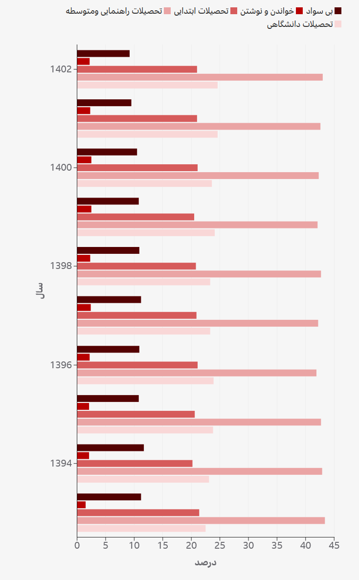 بررسی نتایج گزارش «بودجه خانوار مناطق شهری» در سال ۱۴۰۲ نشان می‌دهد که در این سال ۹/۲ درصد ایرانیان بی‌سواد، ۲/۲ درصد قادر به خواندن و نوشتن بدون تحصیلات رسمی، ۲۱ درصد دارای تحصیلات ابتدایی، ۴۳ درصد دارای تحصیلات راهنمایی و متوسطه و ۲۶/۶ درصد دارای تحصیلات دانشگاهی بوده‌اند.