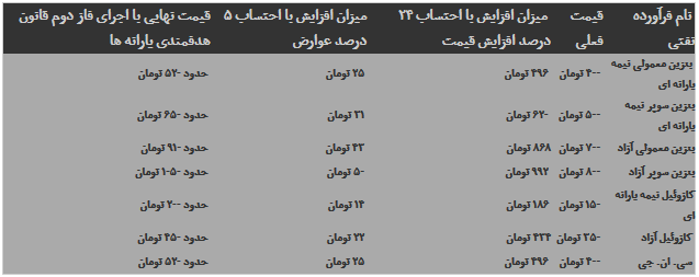 جدول برآوردی افزایش قیمت بنزین، گازوئیل و سی. ان. جی در فاز دوم هدفمندی براساس اظهارات شریعتمداری و طیب نیا