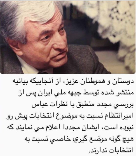 سایت ملیون ایران: مهندس عباس امیر انتظام در نوشته ای که در فیس بوک منتشر شد، در باره بیانیه ای که اخیرا با امصای ایشان و آقایان دکتر داود هرمیداس باوند، دکتر علی رشیدی و آقای حسین شاه حسینی انتشار یافته است توضیحی مبنی بر اینکه ایشان “هیچگونه موضعگیری خاصی نسبت به انتخابات ندارند” منتشر ساخت. تذکر اینکه بیانیه مزبور آنطور که ایشان در توضیح خود نوشته اند نظر شخصی منتشر کنندگان آن بوده و از طرف تشکیلات جبهه ملی ایران نبوده است زیرا مقامات امنیتی در هفته گذشته از برگزاری جلسه شورای مرکزی جبهه ملی ایران برای بررسی انتخابات و اعلام موضع تشکیلات ممانعت نمودند.